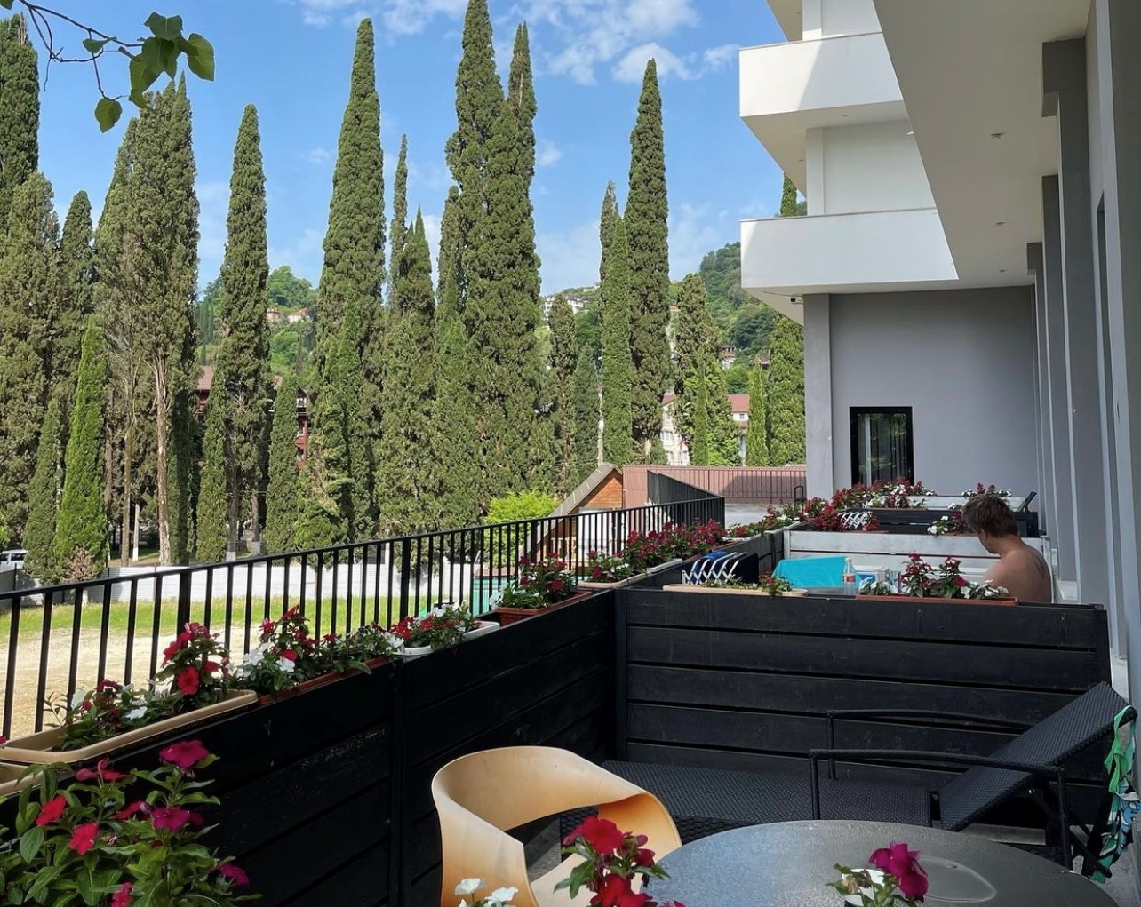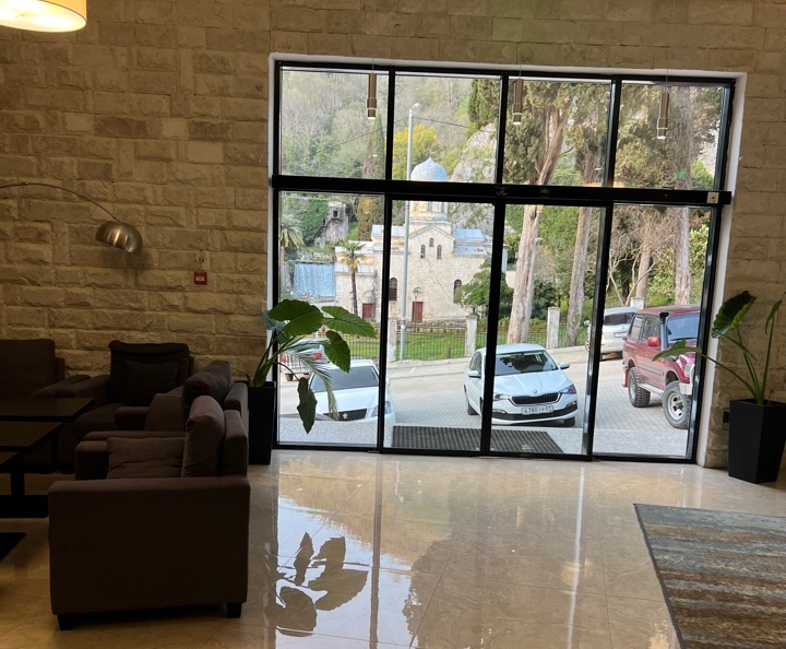 Отель расположен в Новом Афоне, в Абхазии. Маленький живописный город сочетает поражающий воображение ландшафт — морские пляжи, горы, водопады, пещеры с интересными памятниками истории и культуры.