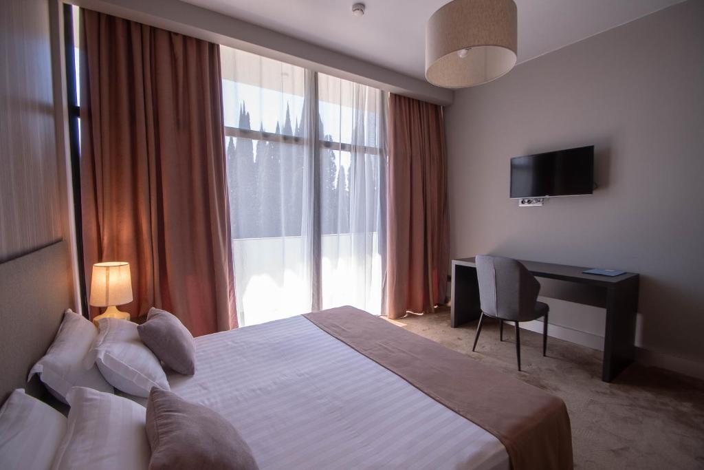 Площадь номера - 50 кв.м. 2 осн. места. 2 доп. места. Балкон. Мебель: вешалка, диван раскладной, зеркало, кровати односпальные /одна двуспальная кровать, прикроватные тумбочки, столик журнальный, шкаф. Оборудование: кондиционер, сейф, телевизор, холодильник. Санузел: с душем, туалетные принадлежности, фен. Сервис: Wi-Fi бесплатно, смена полотенец, смена постельного белья, уборка номера.